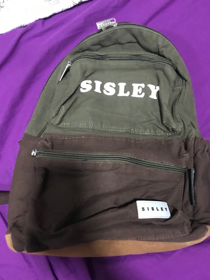 Koyu kahverengi, sentetik kumaştan yapılmış, fermuarlı bölmeleri ve baskılı Sisley logosu bulunan günlük kullanım için uygun kadın sırt çantası.