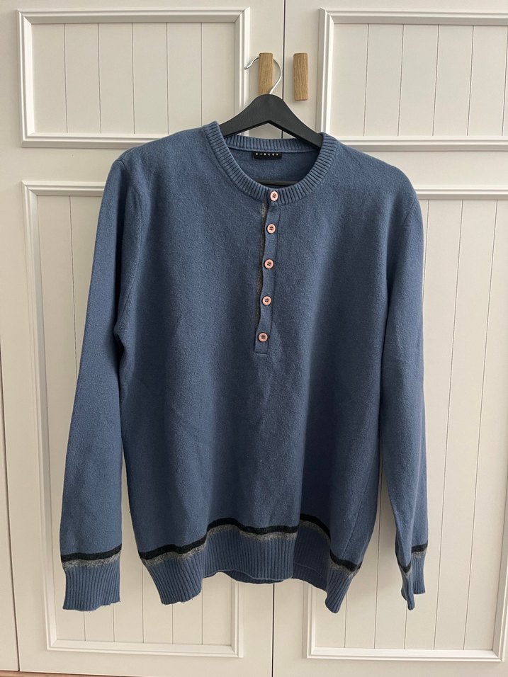 Sisley XL beden mavi erkek kazak, %80 yün karışımlıdır sıcak tutar. Yakasında düğme, belinde ve bileklerde lastik detayı mevcut