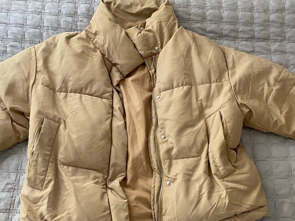 Bej renkli, düğmeli kadın kışlık şişme mont. Keten kumaştan, parlak dokunuşlu, uzun kollu ve normal boyda, rahat kesimlidir. Günlük kullanıma uygundur. Herhangi bir defosu yoktur. S ve M bedenlerine uygundur. ❄️