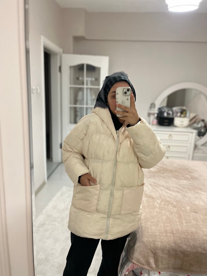 Bej renkte, bol kesim midi şişme mont. Bir defa fotoğraf çekiminde kullanmıştım fakat leke olan yerleri var çıkar diye düşünüyorum. Aldığımda yıkadığım için özellikle kollarında elyaf toplanması var haricinde bir sorun yok. M bedendir sıcak tutar.