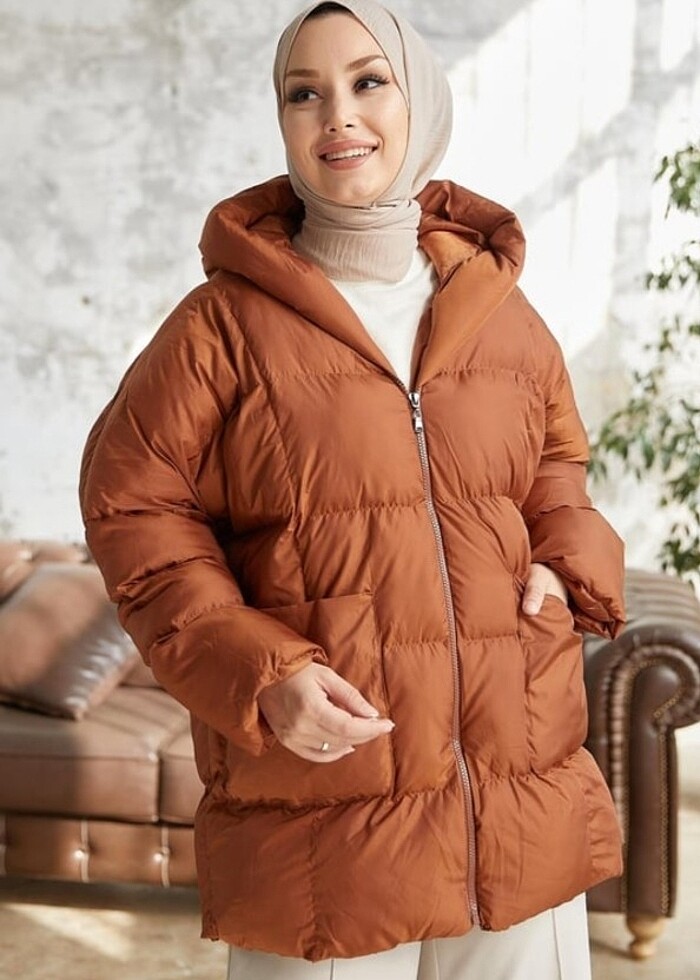 Taba rengi şişme mont. Standart beden. Salaş model. Herhangi bi sorunu yoktur.