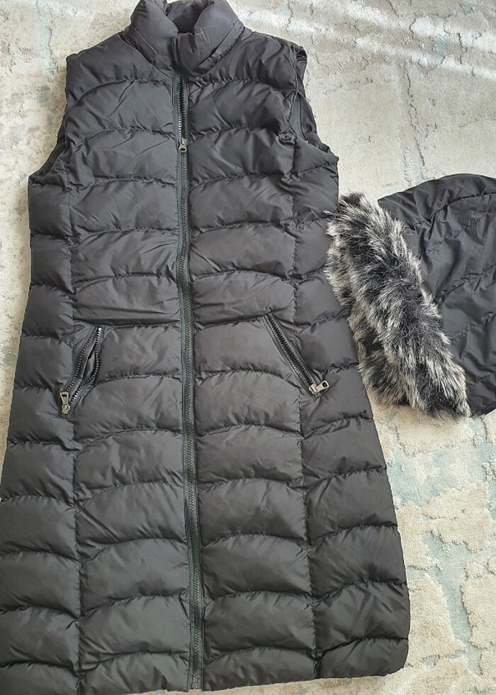 Siyah renk şişme mont, boyu uzun dize geliyor. Yeni