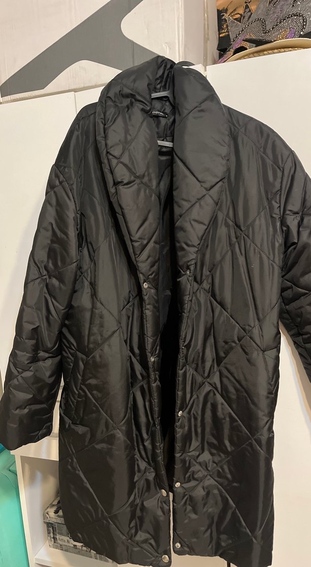 Düğmeli, sivri yakalı siyah midi kadın ceket. Rahat kesim, askılı kollar ve yumuşak sentetik kumaş ile günlük sokak stiline uygun.