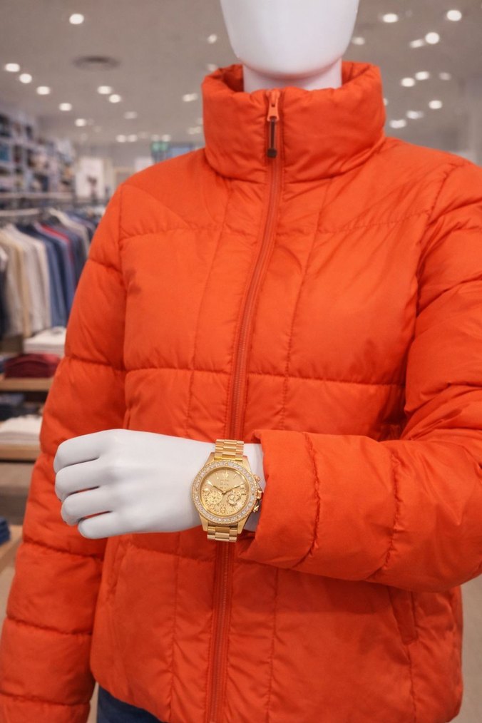 Mağaza vitrininde sergilenen şık şişme mont, kolunda gold renk Michael Fellini saat ile birlikte satılıktır. Kombin halinde, günlük ve şık kullanım için idealdir. ✔️ Mont: Kışlık, şişme model – sıcak tutar ✔️ Saat: Gold renk, taşlı kasa, altın kadran (mavi değil) ✔️ Kullanım: Günlük / şık / özel gün ✔️ Durum: Sıfır / etiketli ✔️ Satış: Set olarak Hızlı kargo Detay ve beden bilgisi için mesaj atabilirsin