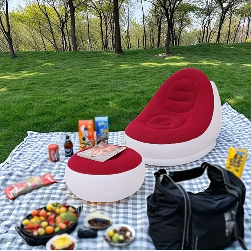 Şişme Rahat Koltuk + Ayak Taburesi (Kırmızı -Beyaz) Renkli 2 Parça Set, Peluş Yüzeyli Yetişkin Şişme Koltuk, Konforlu Şişme Şezlong, İç ve Dış Mekan Kullanımına Uygun.