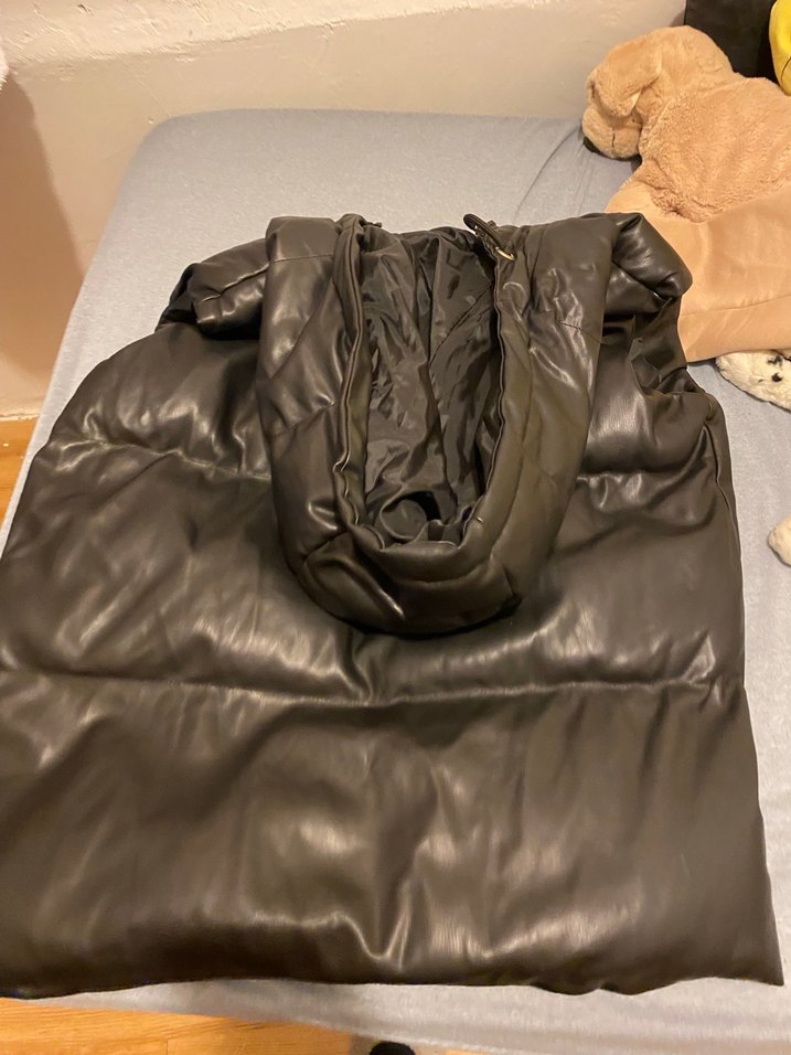 Koyu kahverengi uzun deri ceket, kapüşonlu ve fermuarlı, bol kesim ve askılı kollu sokak stili için uygun.