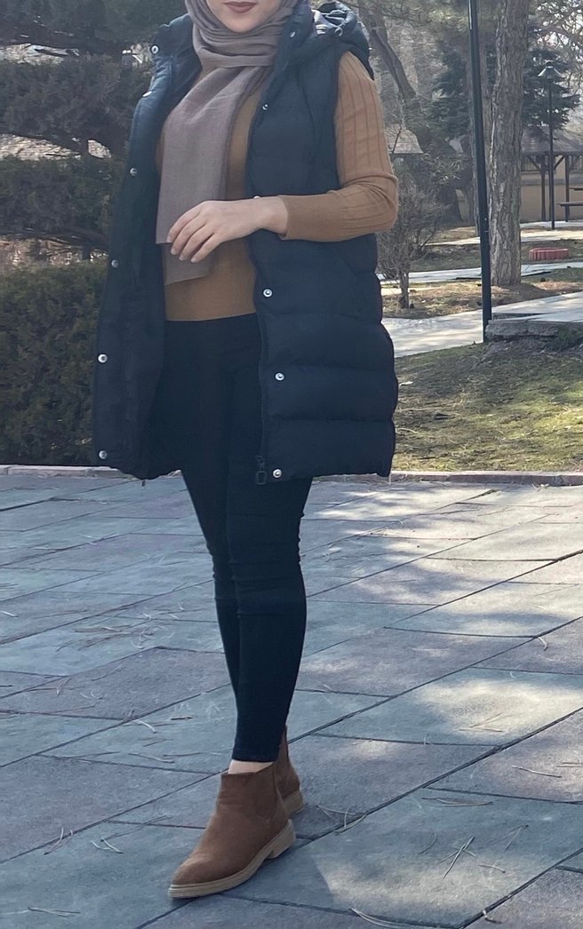 Yumuşak fleece kumaştan, kürklü detaylı, siyah renkli, dar kesim, kolsuz şişme yelek. Boğazlı yakasıyla dış mekan kullanımı için uygundur.