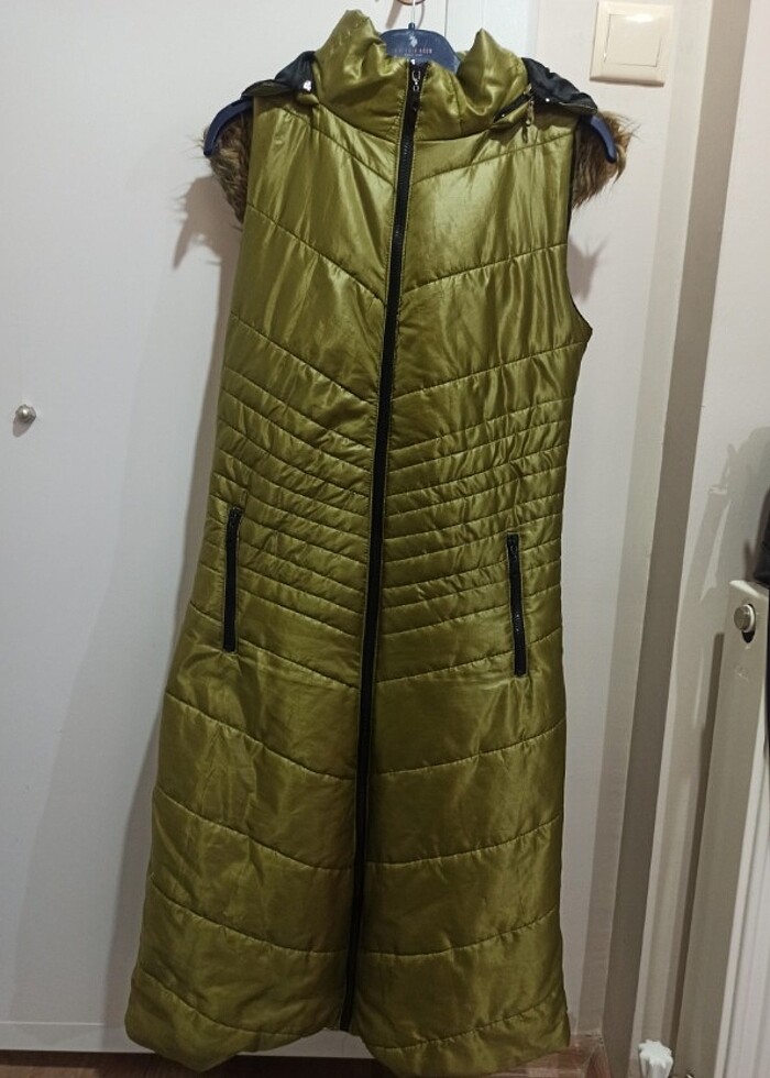 Ürünün çok az kullandım, herhangi bir defosu yok. İcindeki elyafı biraz ince, çok kalın değil yani. Bana dar olduğu için satıyorum.Uzunluk 105 cm, koltuk altı 48 cm. M beden yazıyor fakat kalıbı dar biraz.
