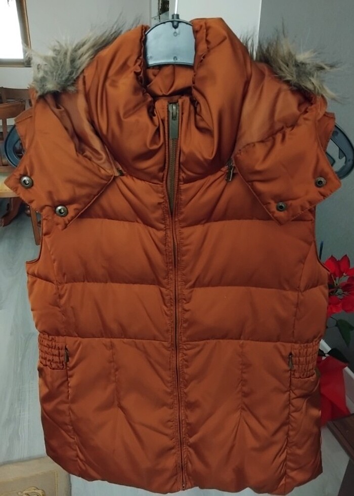 Çok az ve temiz kullanılmış,kapüşonlu yelek.Tarçın rengindedir.