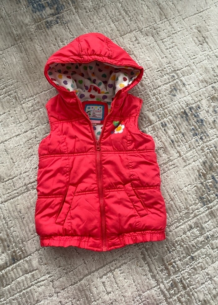 4-5 yaş Yanları cepli içi polarlı kapüşonlu şişme yelek sadece yakasındaki çiçek deseninde solma var onun haricinde yelekte herhangi bir kusur yoktur