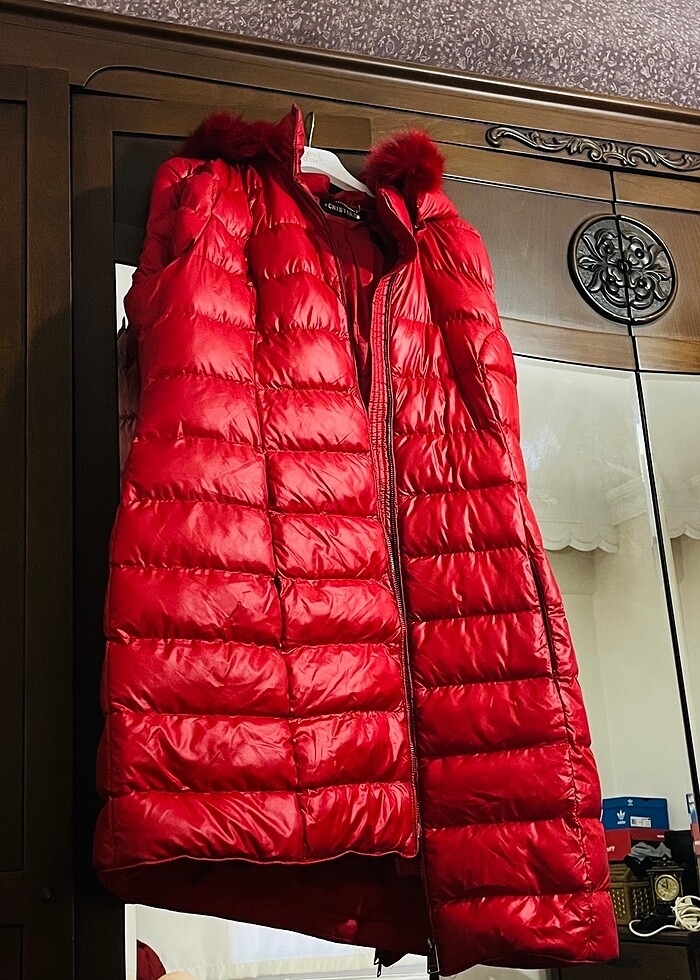 Kırmızı canlı şişme mont kolları gözükmemiş ama var