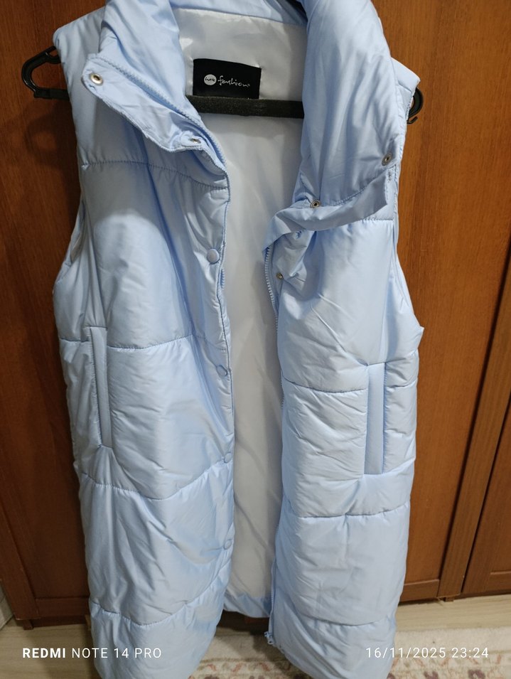 Düğmeli, yüksek yakalı mavi kadın yelek. Yumuşak sentetik kumaştan, ince ve rahat kesimle günlük kullanıma uygun.