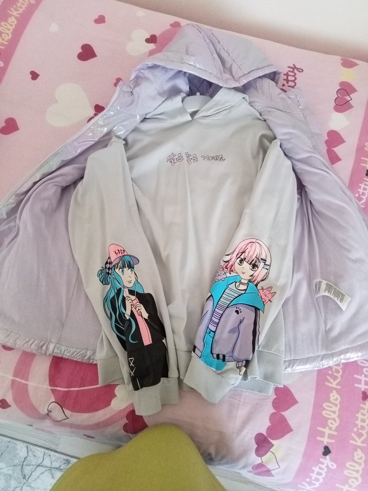 Hafif bol kesim, uzun kollu ve bisiklet yaka kız çocuk sweatshirtü. Canlı baskılı figürler ve fermuar detayı içerir. Yumuşak sentetik kumaştan, pastel pembe renkte.