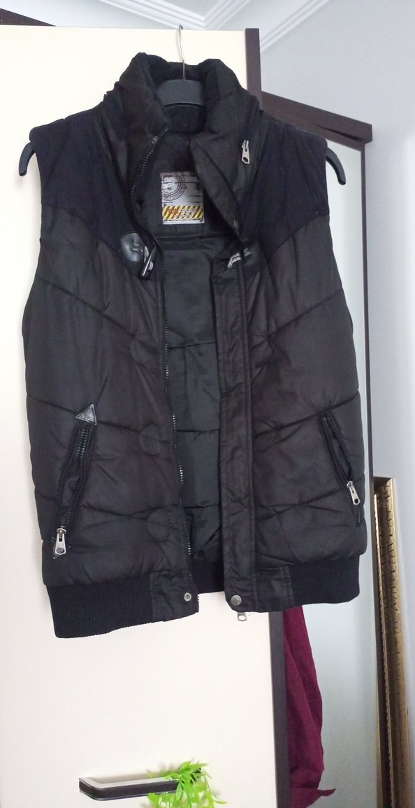 Yumuşak ve sıcak kumaştan, fermuarlı cepli, yüksek yakalı siyah kolsuz yelek. kapşonlu M beden hiçbir sorunu yoktur