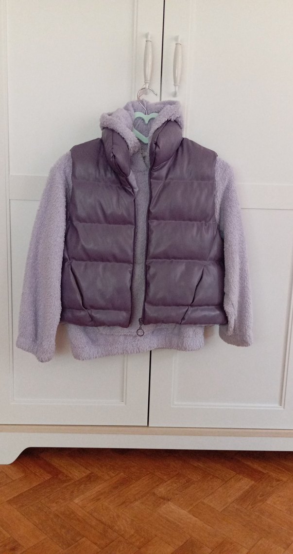 yelek bir kez giyildi sıfır ayarında.alirken farketmemisiz son fotografta minik nokta kadar bi leke var kızım öyle giydi başka sorunu yok. sweatshirt giyildi kullanıma bağlı deforme var ikili olarak satıyorum