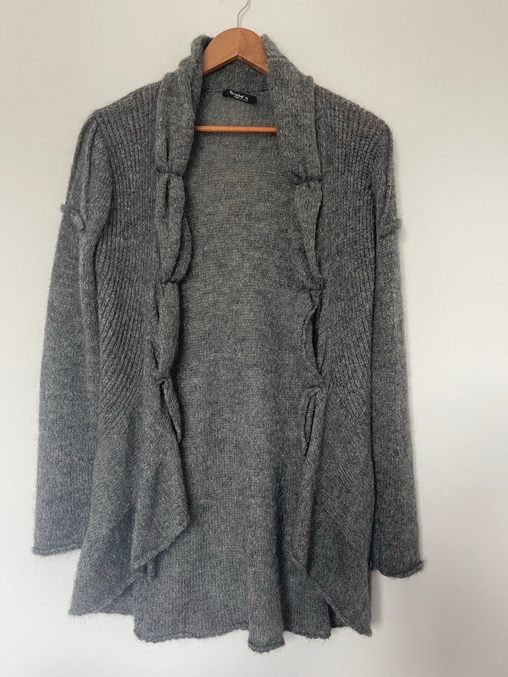 Gri mohair yün karışımlı hırka yaka yüksek Önde volanlı yuvarlak serbest Çok temiz Ölçüleri: Kol altı göğüs genişliği:52 Omuzdan yan uzunluk:81