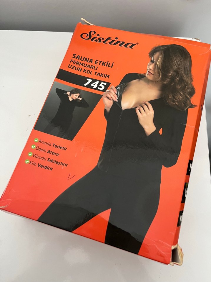 Sistina fermuarlı, uzun kollu siyah korse. Sauna etkili yapısıyla terlemeyi artırır, vücut sıkılaştırır ve kilo vermeye destek olur.