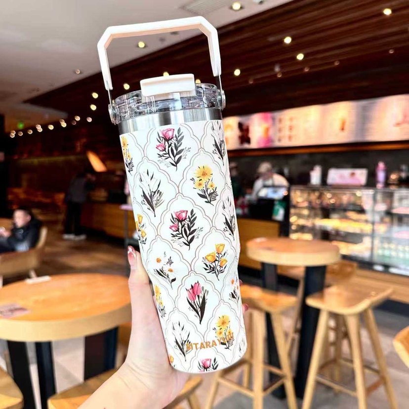 Çiçek desenli beyaz termos, kolay taşınması için saplıdır ve içecekleri sıcak soğuk tutar.