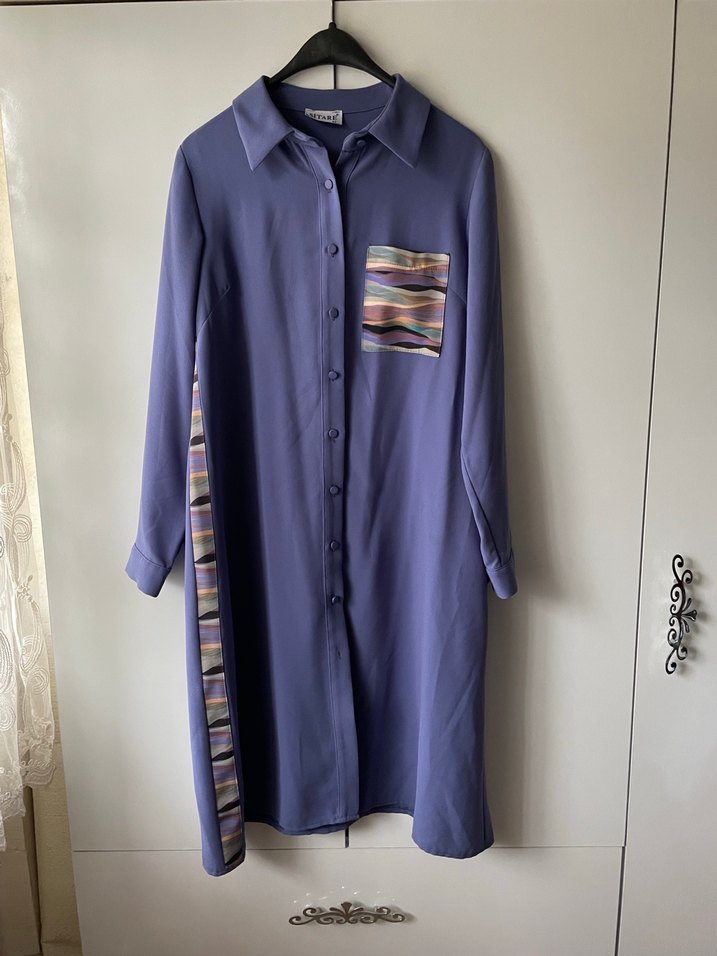 Düğmeli, uzun kollu, bol kesim mor tunik. 42 beden, boy 104 cm, Göğüs 53, Kalça 58, Kol omuzdan 69 cm. Çok az kullanıldı.