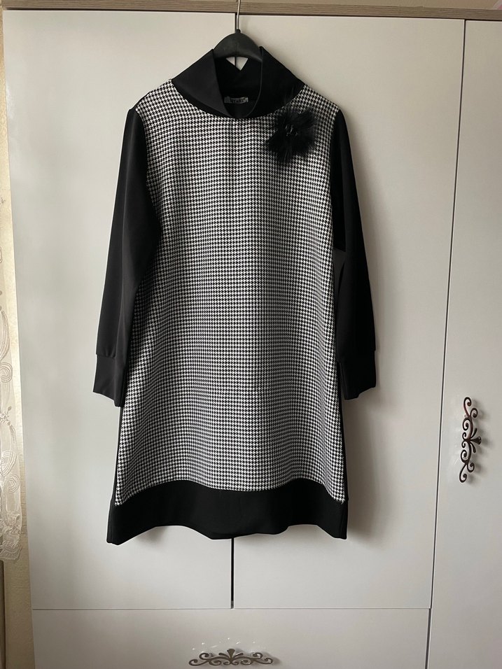 SİTARE Gri Ekose Desenli Uzun Kollu Midi Tunik