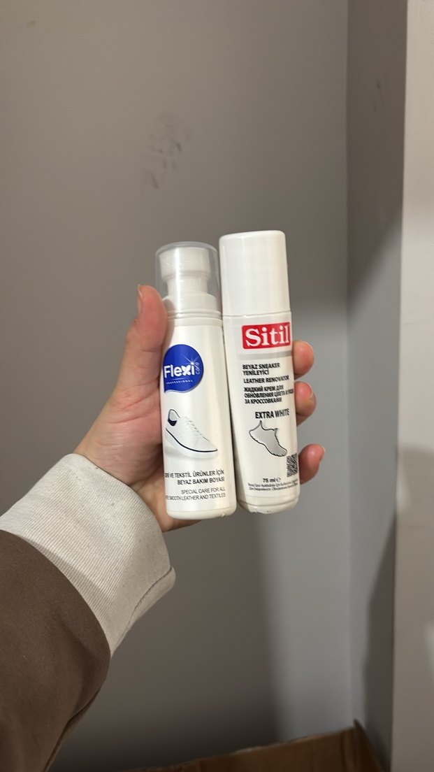 Sitil ve Flexi markalarına ait, beyaz ayakkabılar için ekstra beyazlık sağlayan parlak yüzeyli temizlik ürünleri. Athleisure ve streetwear tarzlarına uygun. Beyaz spor ayakkabı boyası