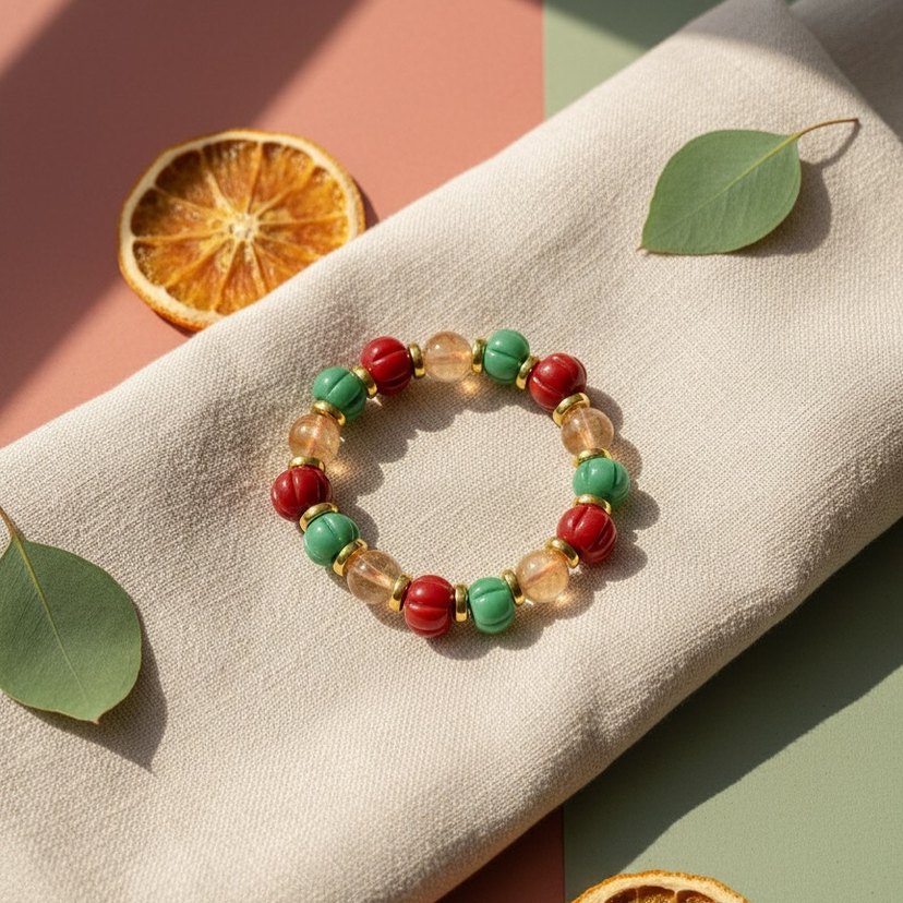 Kırmızı, yeşil renkli el yapımı cam boncuklardan oluşan, altın tonlarında hematit taşı ara parçalarla süslenmiş bohem tarzda renkli bileklik. 10 mm orijinal Sitrin taşı kullanıldı.