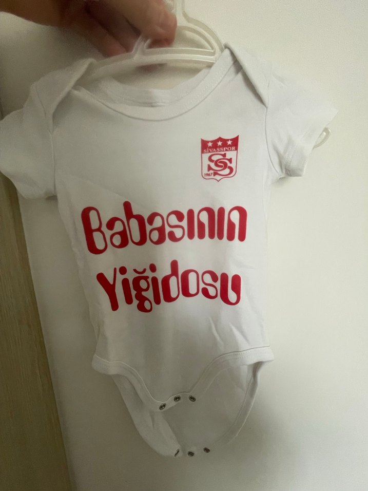 Sivasspor Beyaz, kısa kollu ve V yakalı bebek body. Velcro kapamalı. Üzerinde kırmızı "Babasının Yiğidosu" baskısı bulunur. Yumuşak pastel tonlar.