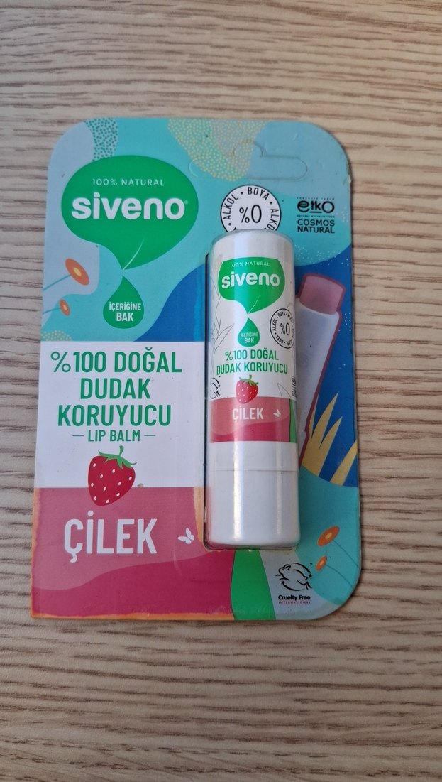 Siveno %100 doğal içerikli çilek aromalı dudak koruyucu, alkolsüz ve boyasızdır, dudaklarınızı nazikçe korur.