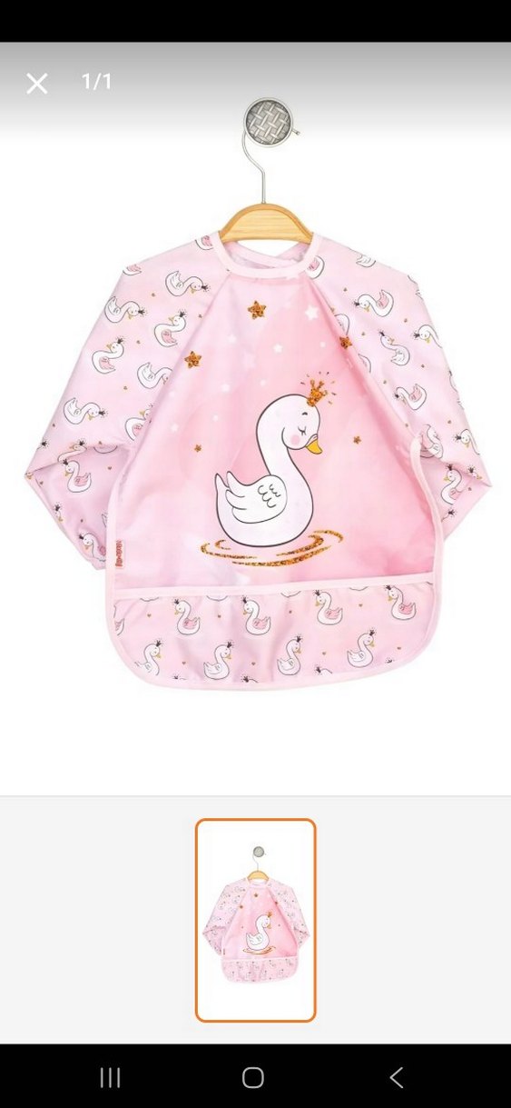 Pastel pembe renkte, uzun kollu ve kuğu desenli baskılı bebek önlüğü. Dökülenleri toplamak için cepli ve yumuşak, rahat kumaştan üretilmiştir. Hiç kullanılmadı sıfır ürün