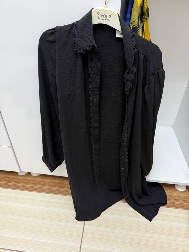 Sivone markalı siyah hamile bluzu, uzun kollu ve bol kesimdir, yaka kısmında fırfır detaylar ve kesik yaka bulunur, yumuşak sentetik kumaştan üretilmiştir.