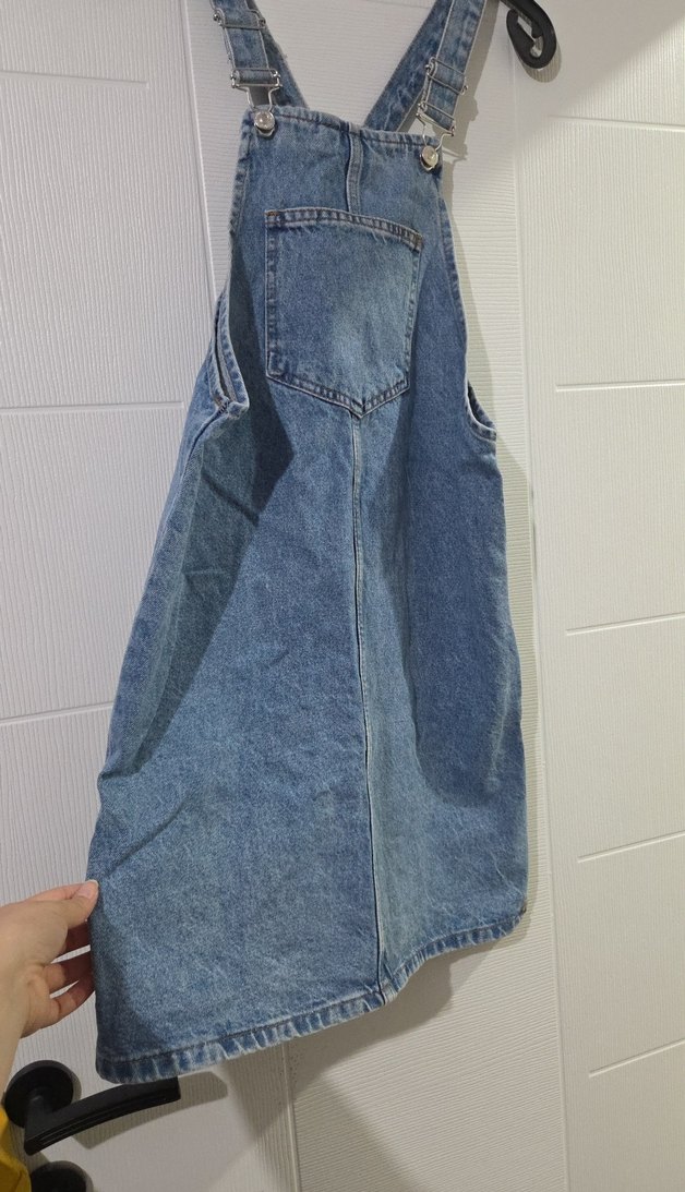 Gri renkli, sivri askılı ve tokalı detaylara sahip, rahat kesimli midi boy denim tulum, günlük kullanıma uygundur.