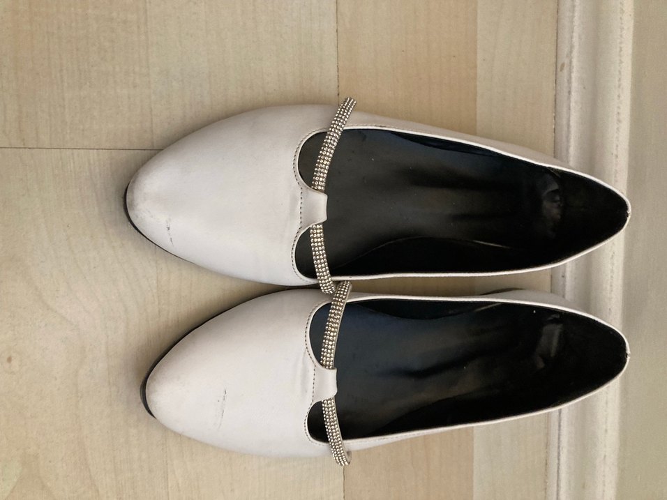 Beyaz kadın babet, sivri burunlu ve tokalı askıya sahip. Kauçuk malzemeden, desen içermeyen ve günlük kullanım için uygun.