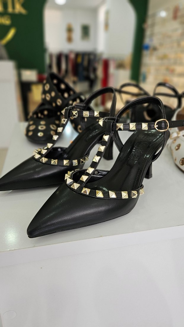 Sivri burunlu, yılan desenli siyah stiletto topuklu ayakkabılar, tokalı ve perçin detaylıdır, cesur parti kombinlerine uygundur. NUMARALARI İÇİN LÜTFEN İLETİŞİME GEÇİN