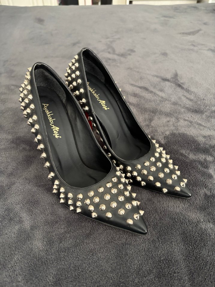 Sivri uçlu, siyah stiletto topuklu ayakkabı.38 numara yazıyor fakat 37 numaraya daha uygun Gümüş çiviler , lastik tabanlı. Parlak detaylarıyla rock punk havası katıyor. Marka: AkkabAtesi.