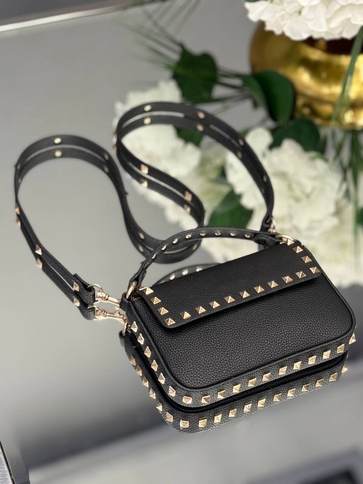 Sivri zımbalarla süslenmiş, kemerli siyah deri kadın çantası. Cesur rock punk tarzını Paris havasıyla birleştirir. Günlük kullanım için uygun.