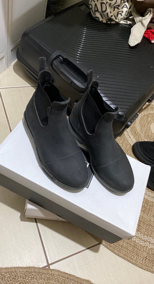 Siyah kauçuk malzemeden yapılmış, dolgu topuklu kadın botları, günlük sokak stili ve athleisure için uygun, desen içermeyen şık tasarım.