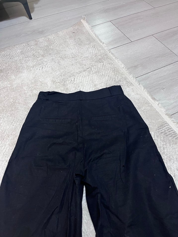 Siyah renkli, keten kumaştan yapılmış, düğmeli ve midi boyda salaş kesim kadın pantolon. Minimalist ve sade tarzda, dış mekan kullanımı için uygun.
