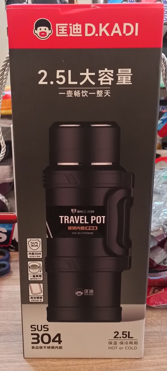 Siyah TRAVELPOT termos, 2.5 litre kapasite ve taşıma kolaylığı için sağlam tutamağa sahip. İçecekleri tüm gün sıcak tutar. ☕
