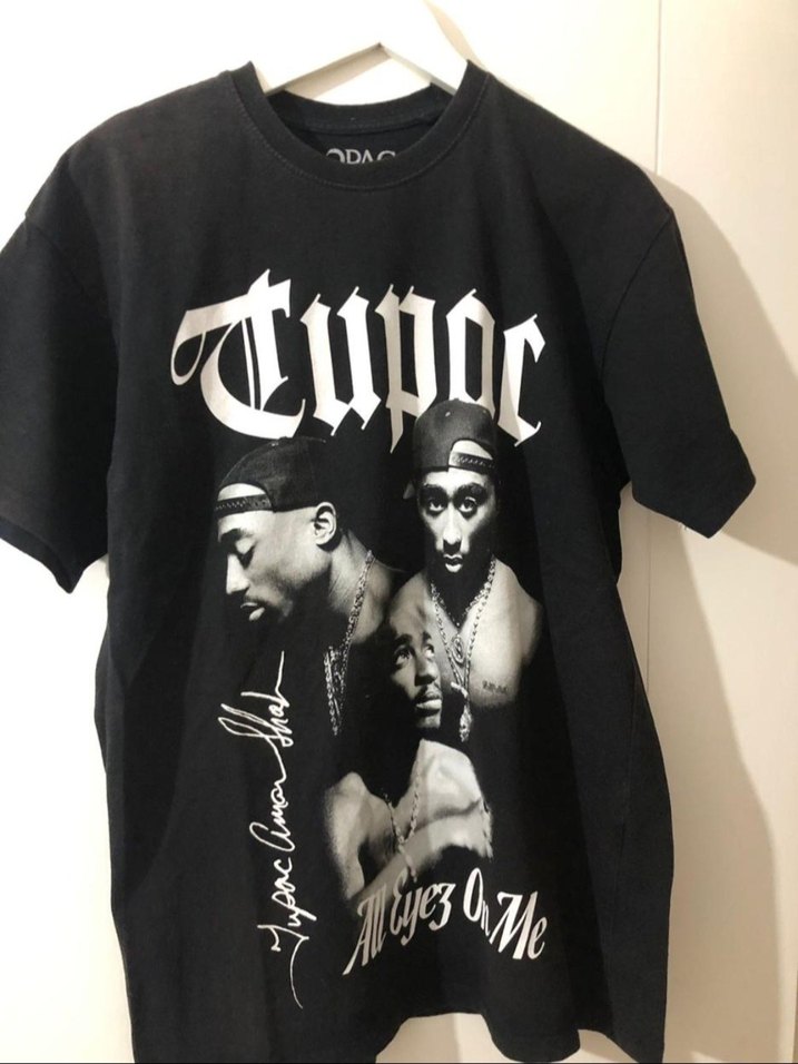 Pamuk siyah erkek tişört, Tupac baskılı, bol kesim, kısa kollu ve yuvarlak yaka. Dökümlü tasarımıyla sokak stiline uygun.
