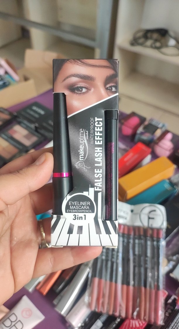 Siyah renkli 3'ü 1 arada; eyeliner, maskara ve kaş kalemi içerir. Suya dayanıklı sahte kirpik etkisi sağlar.