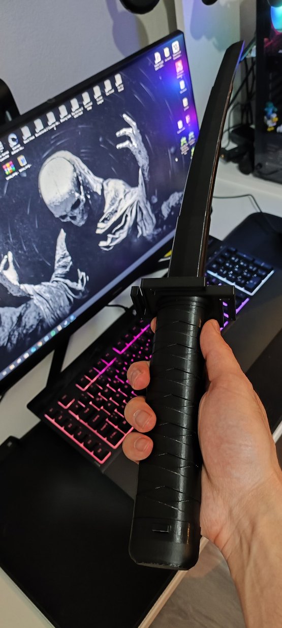 Detaylı saplı siyah kılıç aksiyon figürü, koleksiyon veya sergileme için uygun. Koyu renk dikkat çekici görünüyor. ️