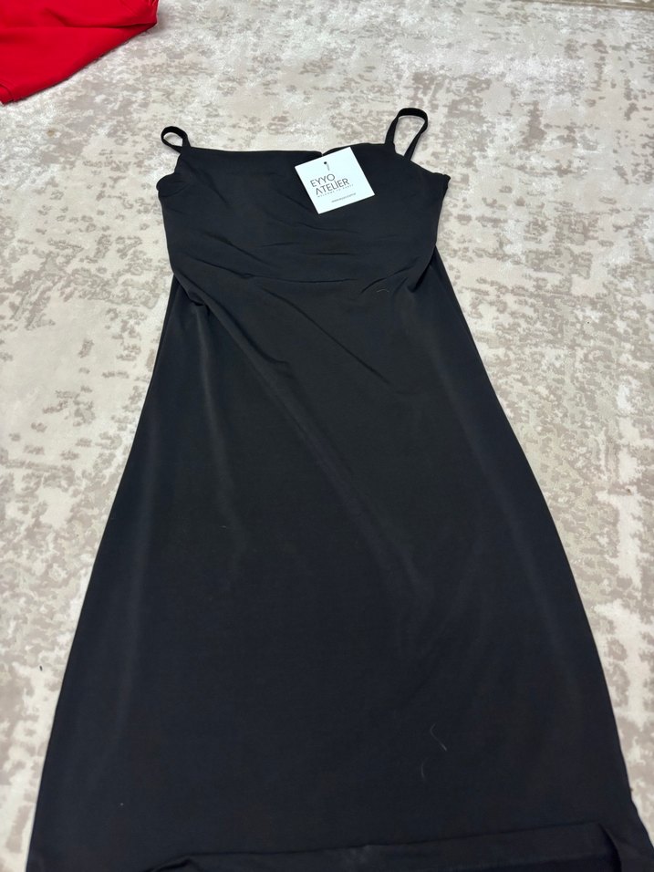 Siyah, askılı ve uzun kesimelbisesi, vücuda oturan kesime sahiptir. Kalıbı dardır. S bedene daha iyi olur bu nedenle beden seçeneğine s beden girilmiştir