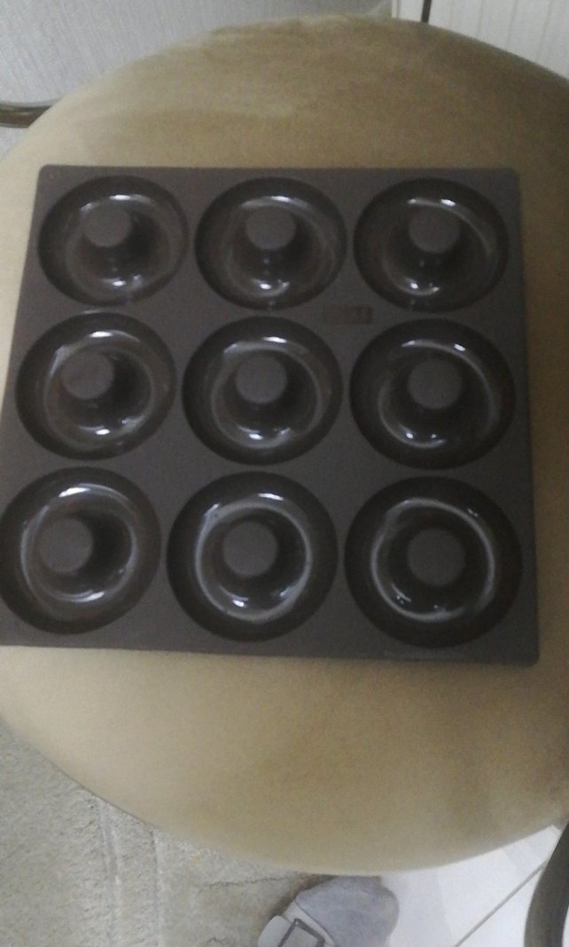 Koyu kahverengi renkte, 9 adet donut yapmaya uygun dayanıklı kek kalıbıdır.