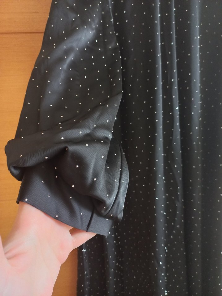 Siyah, parlak kumaşlı uzun, bol kesim abiye Puantiyeli, yakası kesik ve askılı kollu, drapeli, gotik tarzda, romantik akşamlar için uygun. düğün nişan kız isteme icin uygundur. gül detaylı fiyonkuda bulunur.