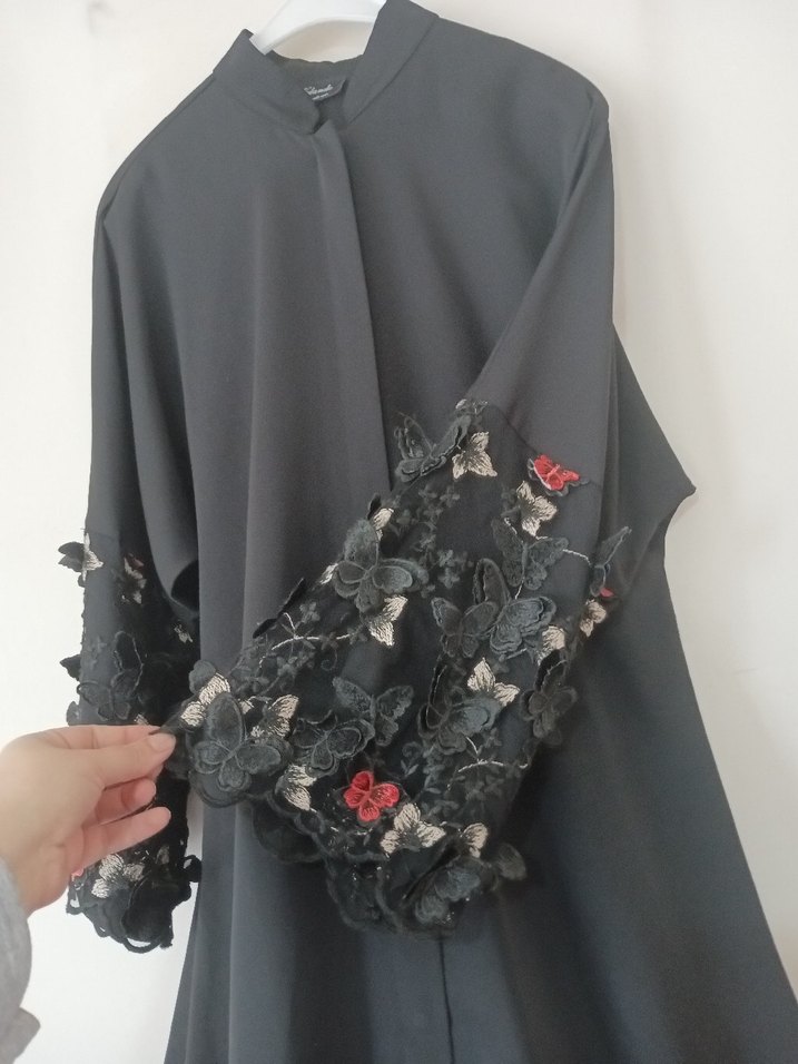 Yüksek yakalı,, drapeli ve nakışlı çiçek detaylı uzun kollara sahiptir. abaya standart beden on trafinda kullanıma engel olmayan hafif deformeleri mevcut