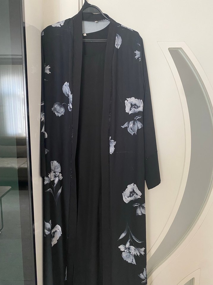 Siyah uzun kollu, taşlı şık ve günlük be davetlerde kullanılan bir takımdır dökümlü ve baskılı çiçek desenli, ipeksi kumaştan kadın abaya takım kemeri ve şalıda mevcuttur çok çok güzel bir takımdır