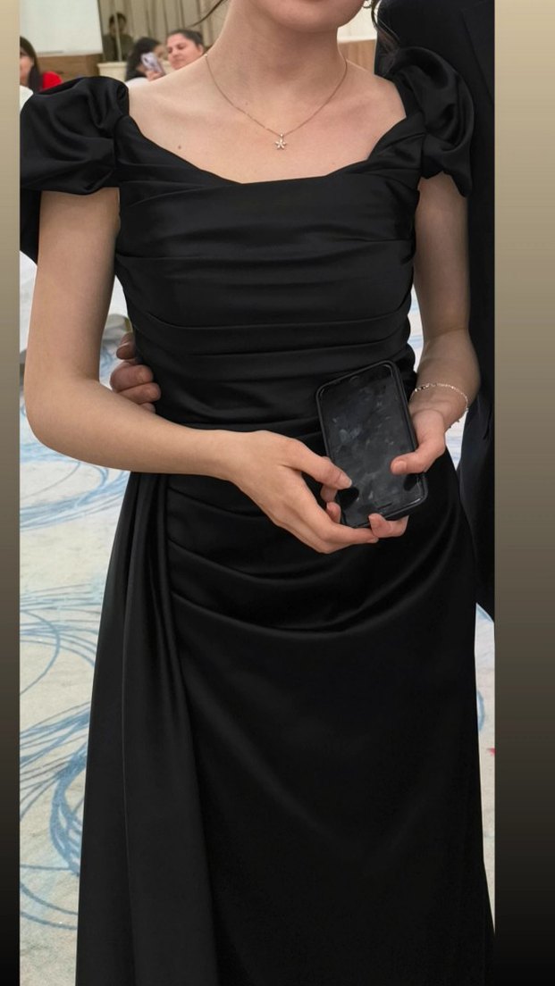 Sadece bir kere giyildi. Siyah, vücuda oturan diz kapağına kadar yırtmaçlı abiye. Düğünler için klasik ve şık bir tercih.