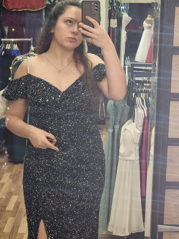 Simli dokunuşlu, düşük omuzlu siyah uzun abiye elbise. İnce kesimi ve yırtmaç detayı ile dikkat çekici, cesur bir görünüm sunar. ✨