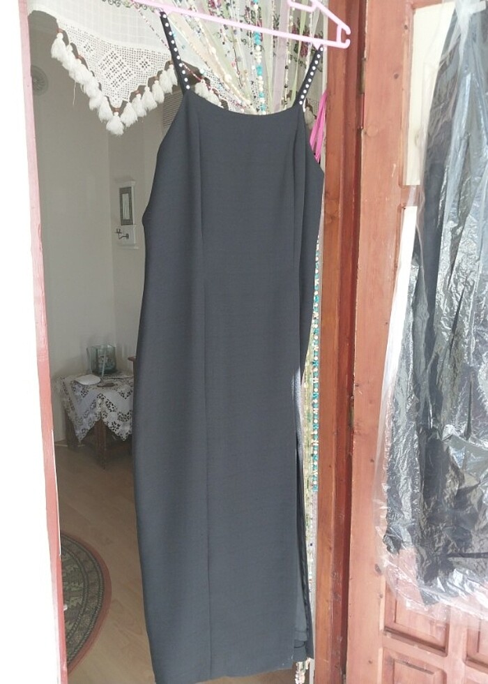 Tasarım elbise. Krep kumaş. Bel 80 cm. Boy kol altından itibaren 116 cm.
