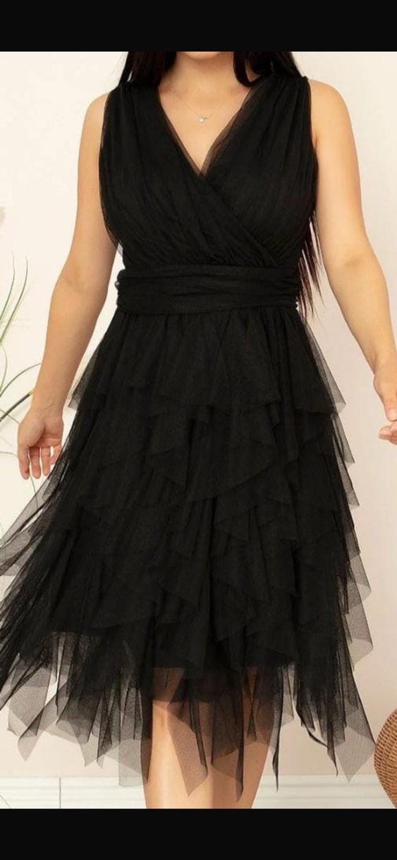Siyah, v yaka midi abiye elbise, kat kat fırfır detaylı elbise. Bir kez giyildi ,bedeni olmadığı için giyemedim.